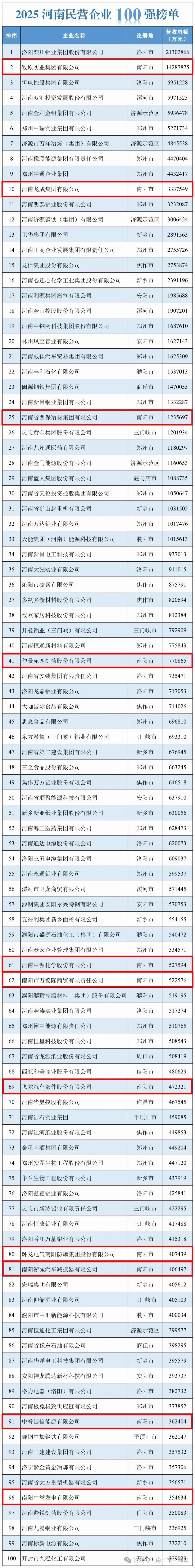 9月30日,河南省工商联发布“2025河南民营企业100强”榜单。南阳市共有11家企业上榜,分别是牧原实业集团有限公司(第2位)、河南龙成集团(第10位)、河南省西保冶材集团有限公司(第25位)、仲景宛西制药股份有限公司(第41位)、河南中源化学股份有限公司(第61位)、南阳市万德隆商贸有限责任公司(第62位)、飞龙汽车部件股份有限公司(第69位)、卧龙电气南阳防爆集团股份有限公司(第80位)、南阳淅减汽车减振器有限公司(第81位)、中誉国信能源有限公司(第91位)、南阳中誉发电有限公司(第96位)。