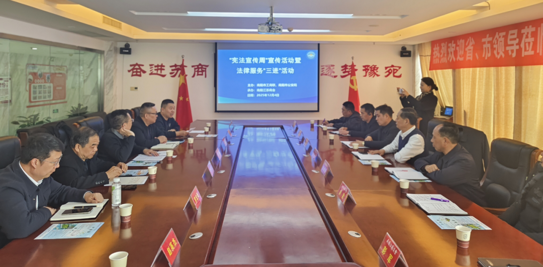 12月4日,由南阳市工商联、市公安局联合主办的“宪法宣传周”宣传活动暨法律服务“三进”活动在南阳江苏商会成功举办。市工商联党组成员、副主席魏剑理,市公安局经侦支队副支队长简国杰出席活动,市工商联相关科室负责同志,市公安局经侦支队有关同志,南阳江苏商会会长华伟及20余位会员企业负责人参加活动。