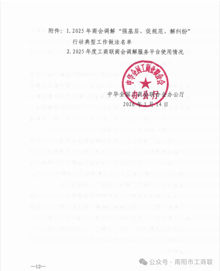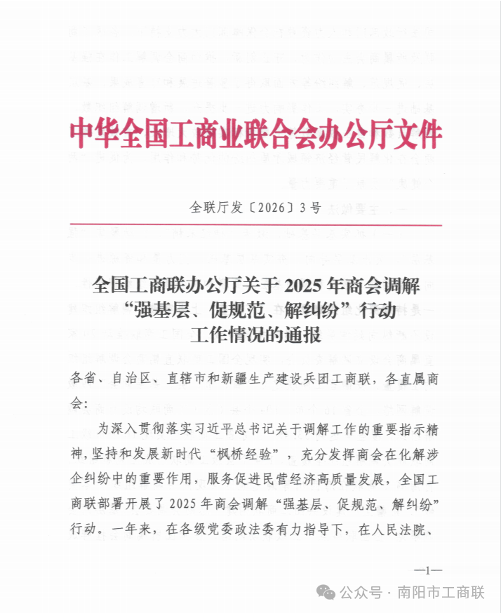 日前,全国工商联通报了2025年商会调解“强基层、促规范、解纠纷”行动工作情况,并发布了典型工作做法名单。南阳市工商联“三位一体、双向发力、专兼结合,持续推动商会调解工作提质增效”工作做法成功入选,是我省入选该名单的三个工作做法之一。